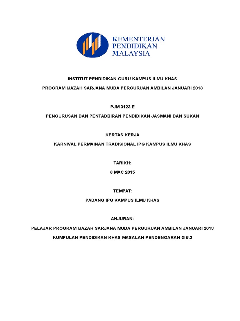Karnival permainan tradisional guli anjuran persatuan guli ipg kampus pendidikan islam dengan kerjasama jabatan pendidikan jasmani dan kesihatan tarikh 17 mac 2014 tempat. Lampiran 3 74 cara bermain bagi setiap permainan tradisional rujuk kertas kerja bagi setiap permainan tradisional. Kertas kerja kawad kaki.